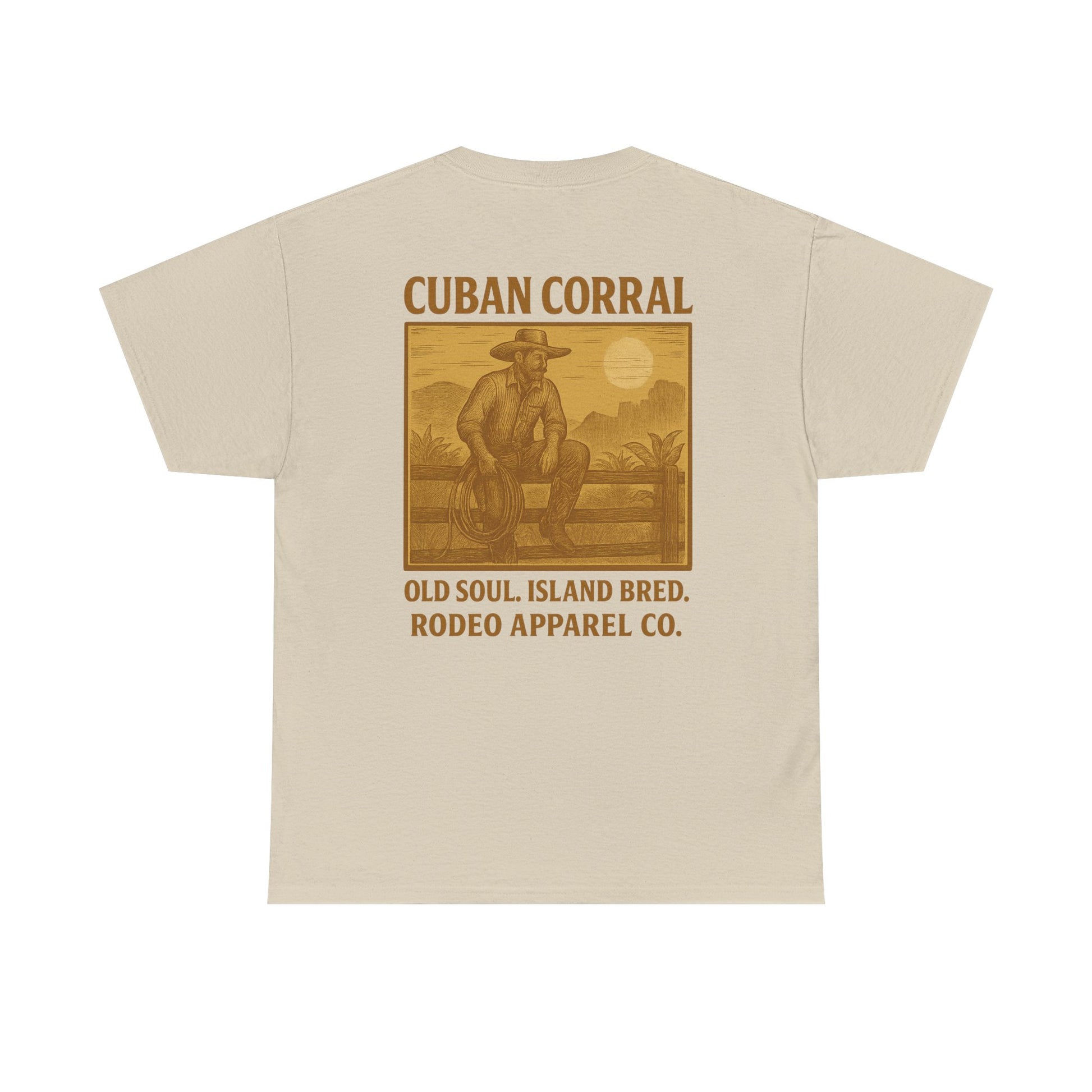 Old soul. Island bred. The Cuban Corral tee honors the quiet strength of the guajiro—Cuba’s traditional cowboy. Set against a backdrop of rolling tobacco fields and rising sun, this vintage-style design captures a timeless moment: a rugged rancher resting on a worn corral fence, lasso in hand, gaze steady. With warm sepia tones and a heritage feel, this shirt speaks to the grit of the land and the pride of its people.