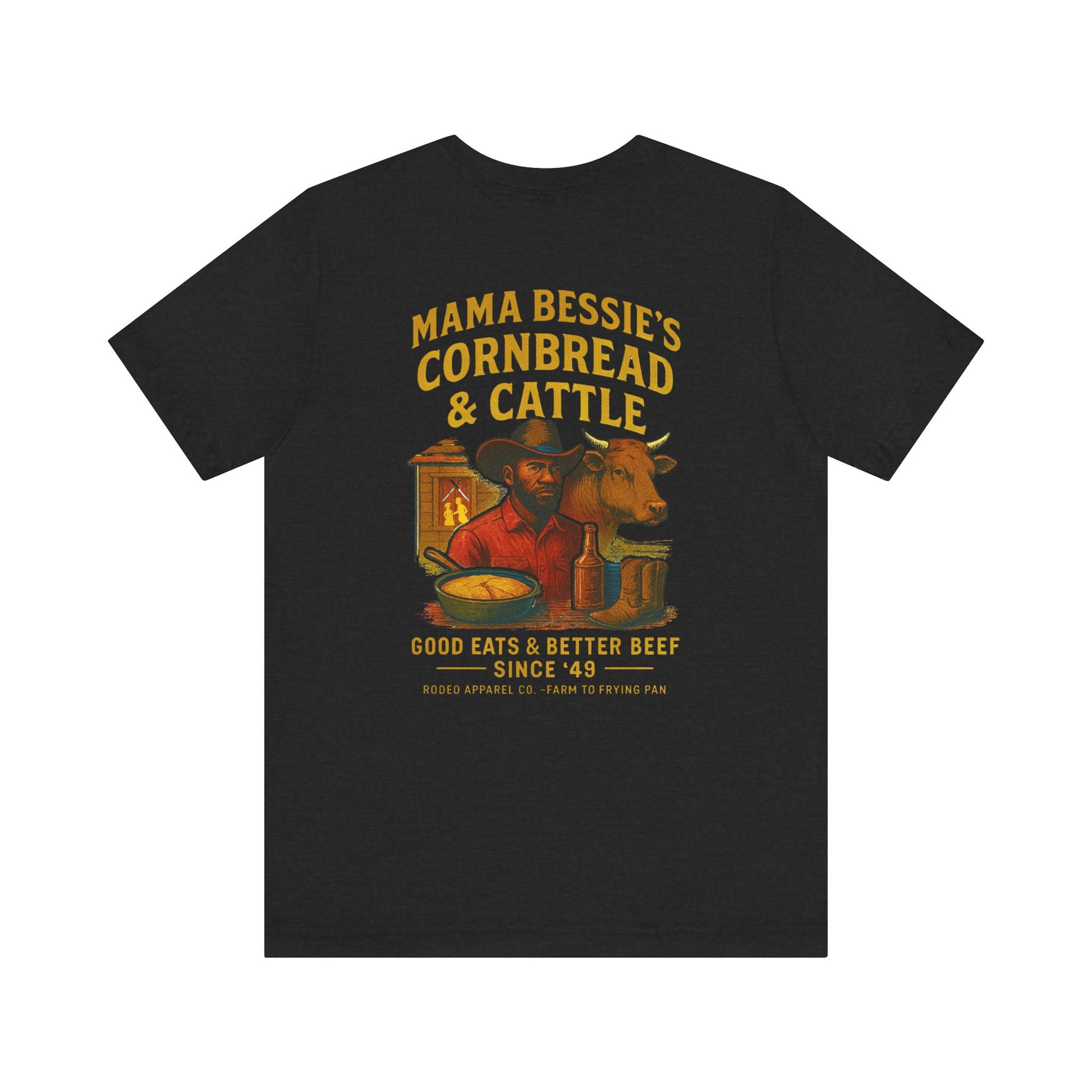 A tribute to front porch wisdom and down-home grit, the Mama Bessie’s Cornbread & Cattle Tee serves up southern charm with a side of attitude. Featuring hand-drawn artwork of a cast-iron skillet and a longhorn silhouette, this shirt captures the soul of a kitchen that feeds ranch hands and kin alike.