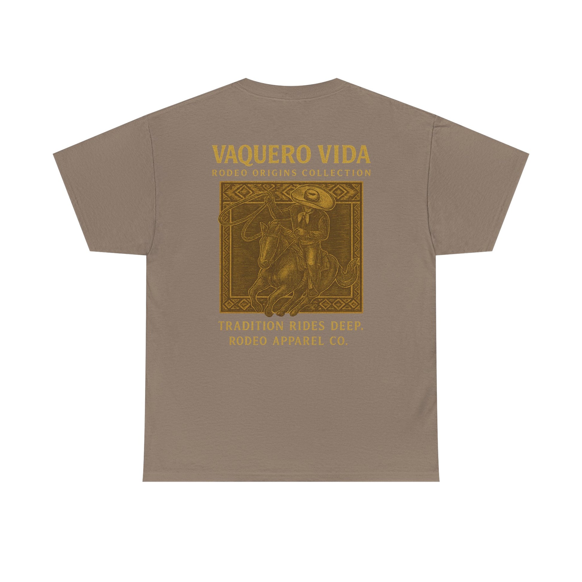 Ride with pride. This Vaquero Vida tee pays tribute to the original cowboy—the Mexican charro. Featuring a bold sepia-tone illustration of a charro mid-rodeo, framed by traditional Aztec patterns, this design captures the strength, honor, and heritage of vaquero culture. A symbol of deep roots and fearless tradition, this piece stands for the riders who came before and the legacy they left behind.